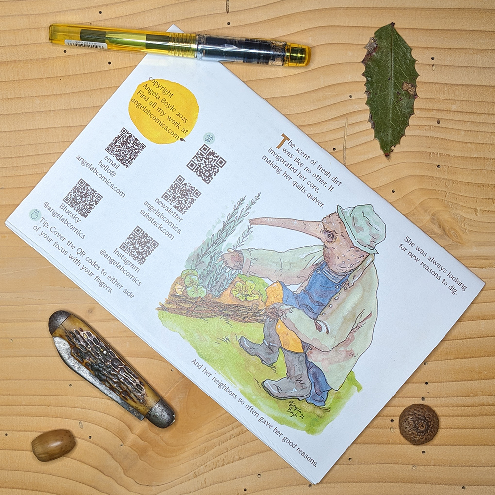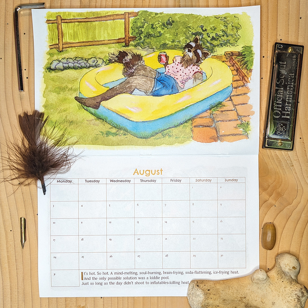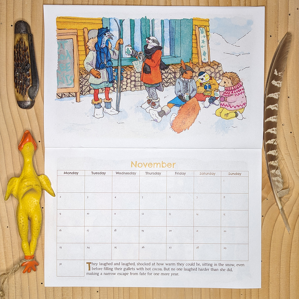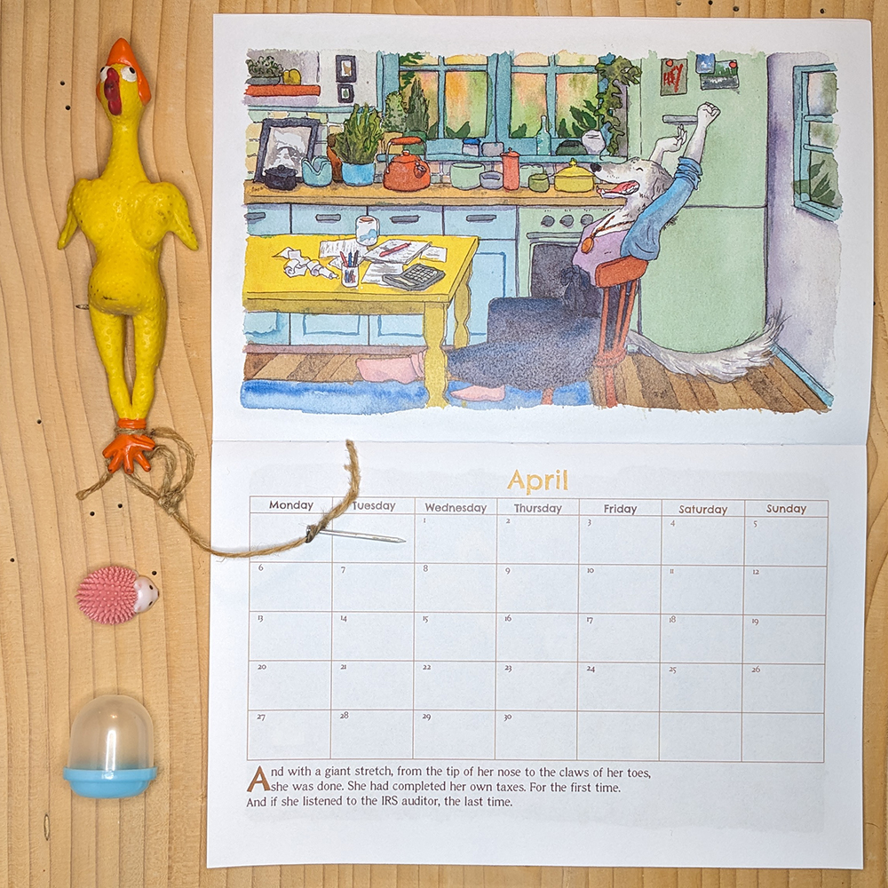 Wonderful animal women adorn this 2026 calendar (January start). The illustrations were originally hand-drawn in ink and pen, then watercolored. A very short fiction accompanies each illustration. Despite being mere sentences, each is intended to give you a little giggle. A bright spot in your month, but hopefully every week or day.