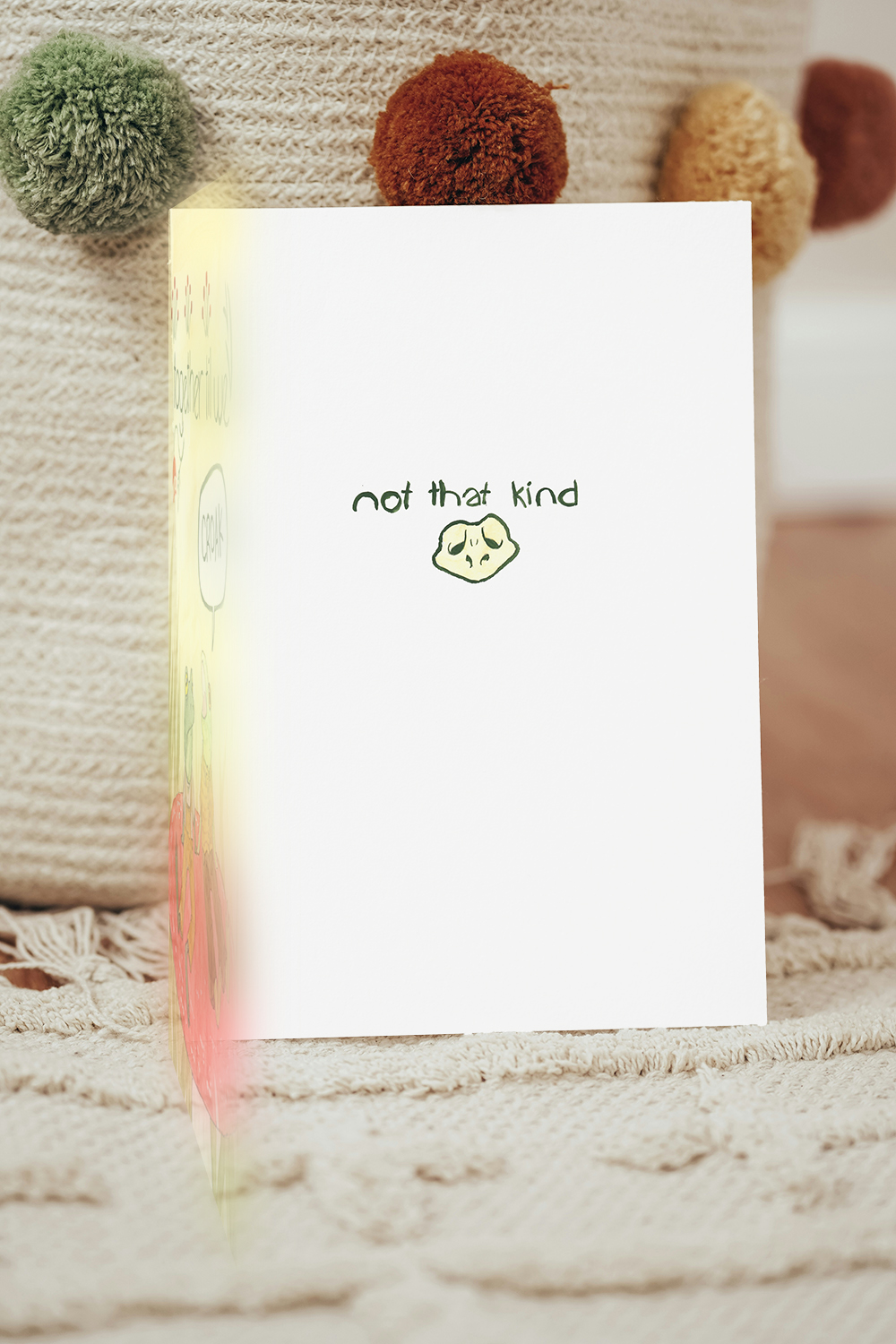 Interior: mostly blank with a simplified frog skull below the text: Not that kind.