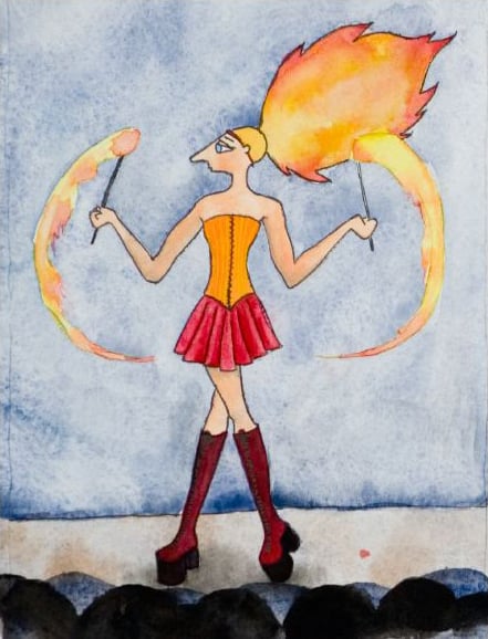 In quiet solitude, a fire breathing street performer finishes up her act for the day. Or, you can read this comic backwards for a completely opposite story.